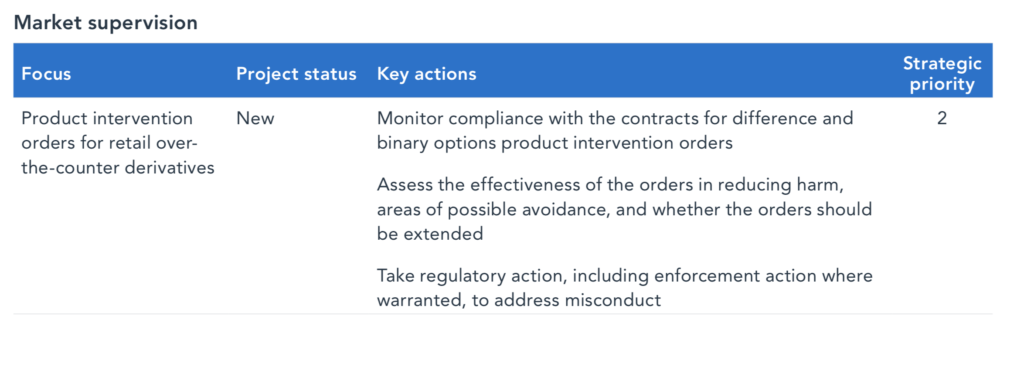 The product intervention orders for CFDs and binary options which took effect earlier in 2021 are among the foci for the regulator.