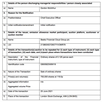 Beeks Financial Cloud Group PLC (LON:BKS), a cloud computing and connectivity provider for the financial markets, has been informed that Gordon McArthur, Chief Executive Officer has today sold a total of 750,000 ordinary shares of 0.125 pence each at a price of 119p per share.