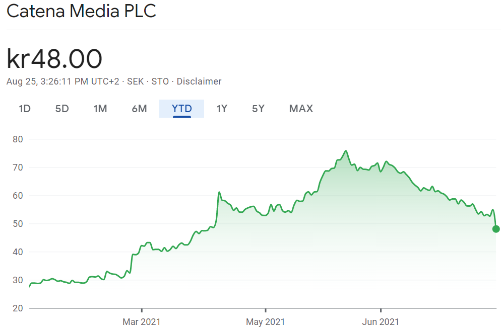 Catena Media share price graph 2021 YTD. Source: Google Finance.