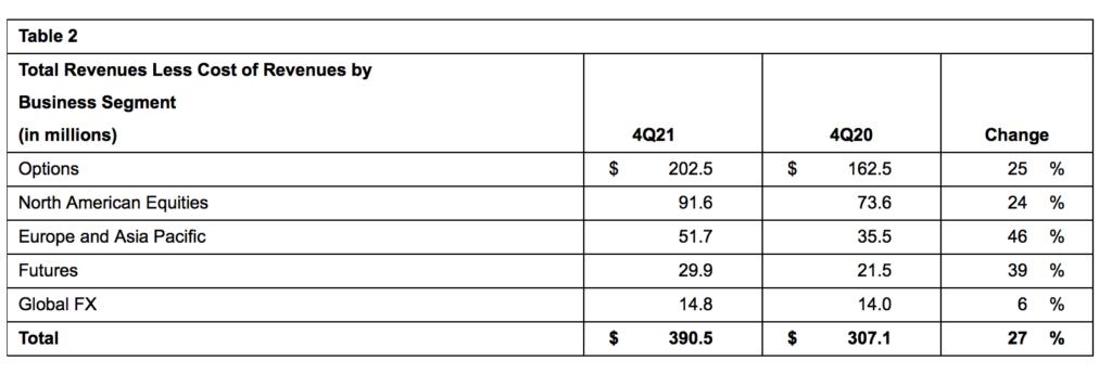 Across all business segments, total revenues less cost of revenues (referred to as “net revenue”) of $390.5 million increased 27 percent, compared to $307.1 million in the prior-year period, reflecting increases in net transaction and clearing fees and access and capacity fees. Inorganic net revenue1 in the fourth quarter of 2021 was $17.0 million.