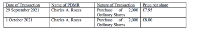 Mr Rozes bought 2,000 shares on September 29th and 2,000 shares on October 1st at a price per share of £7.95 and £8.00 respectively.