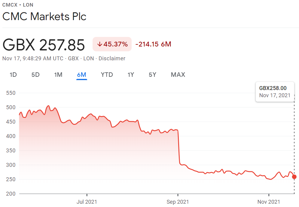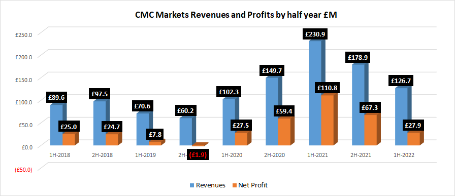 CMC Markets reported Revenues (or what it terms Net Operating Income) of £126.7 million for the six month period ended September 30, 2021, which was down by 23% from the previous 6-month period and off by nearly half (45%) from a year ago in 1H-2021. Profits were also down sharply, by 36% from the previous six months and by 75% from last year.