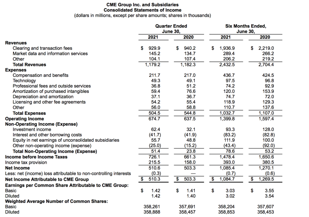 CME Group Inc. (NASDAQ:CME) today reported financial results for the second quarter of 2021.