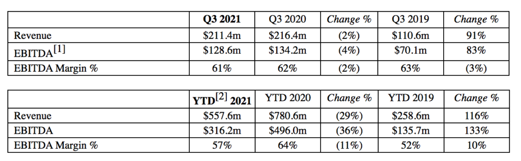 Revenue in Q3 2021 amounted to $211.4 million, well ahead of pre-pandemic levels. However, the result was lower than a year earlier (Q3 2020: $216.4m). The revenues were driven by the Customer Income, which was $156.9 million during the quarter (Q3 2020: $240.0m).