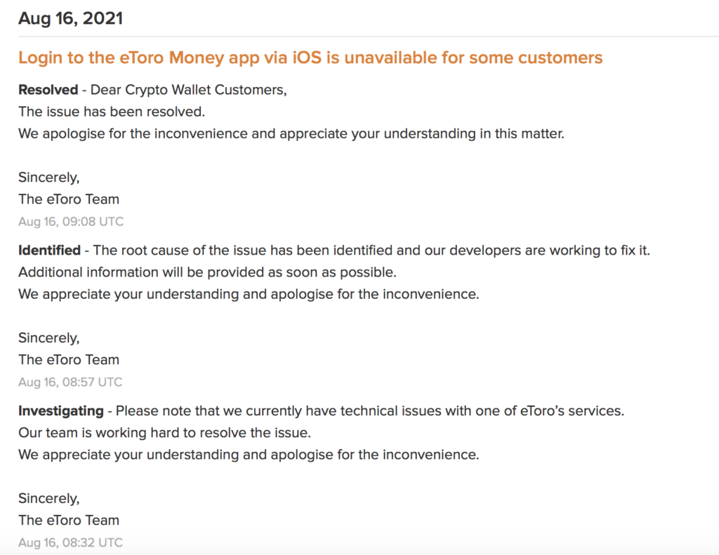 Login to the eToro Money app via iOS was unavailable for some customers, the company said at 08:32 UTC today. About 30 minutes later, eToro said the root cause of the issue was identified and the eToro developers were working to fix it.