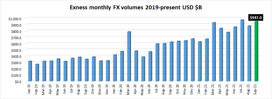Exness’ previous best month was July 2021, which saw the broker transact $974.5 billion in volumes. Last month (September 2021) Exness reported $947 billion in volumes.