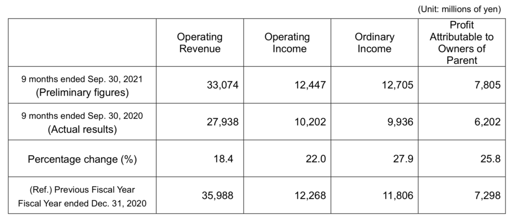 - Operating revenue for the nine months to September 30, 2021 amounted to JPY 33 billion, up from JPY 27.9 billion in the equivalent period a year earlier.