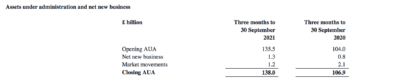 A positive market movement of £1.2 billion, combined with net new business has driven AUA to £138.0 billion as at 30 September 2021.