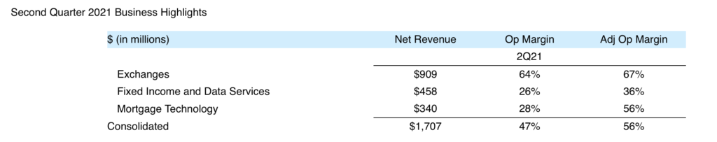 Second quarter consolidated net revenues were $1.7 billion, up 22% year-over-year including exchange net revenues of $909 million, fixed income and data services revenues of $458 million and mortgage technology revenues of $340 million.