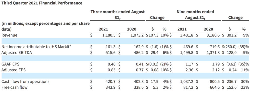 IHS Markit Ltd (NYSE:INFO), a world leader in critical information, analytics and solutions, today reported results for the third quarter ended August 31, 2021.