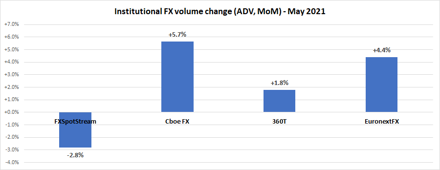 Overall, trading volumes were up 2.3% MoM in May, with all ECNs but FXSpotStream posting modest single-digit percent gains over April. April saw a sharp 16% decline in institutional trading volumes, after a very hot start to the year for FX trading throughout Q1-2021.