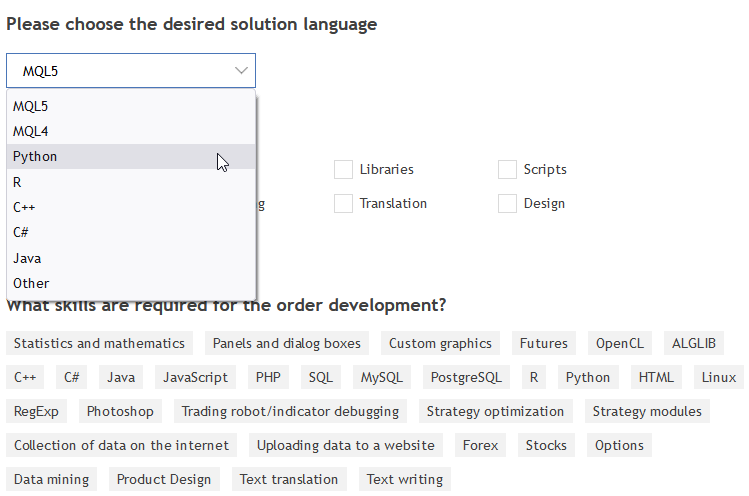 MetaQuotes, the company behind popular trading platforms MT4 and MT5, has extended the list of programming languages in Freelance orders, enabling you to select Python, R, C++, C#, Java, or others.