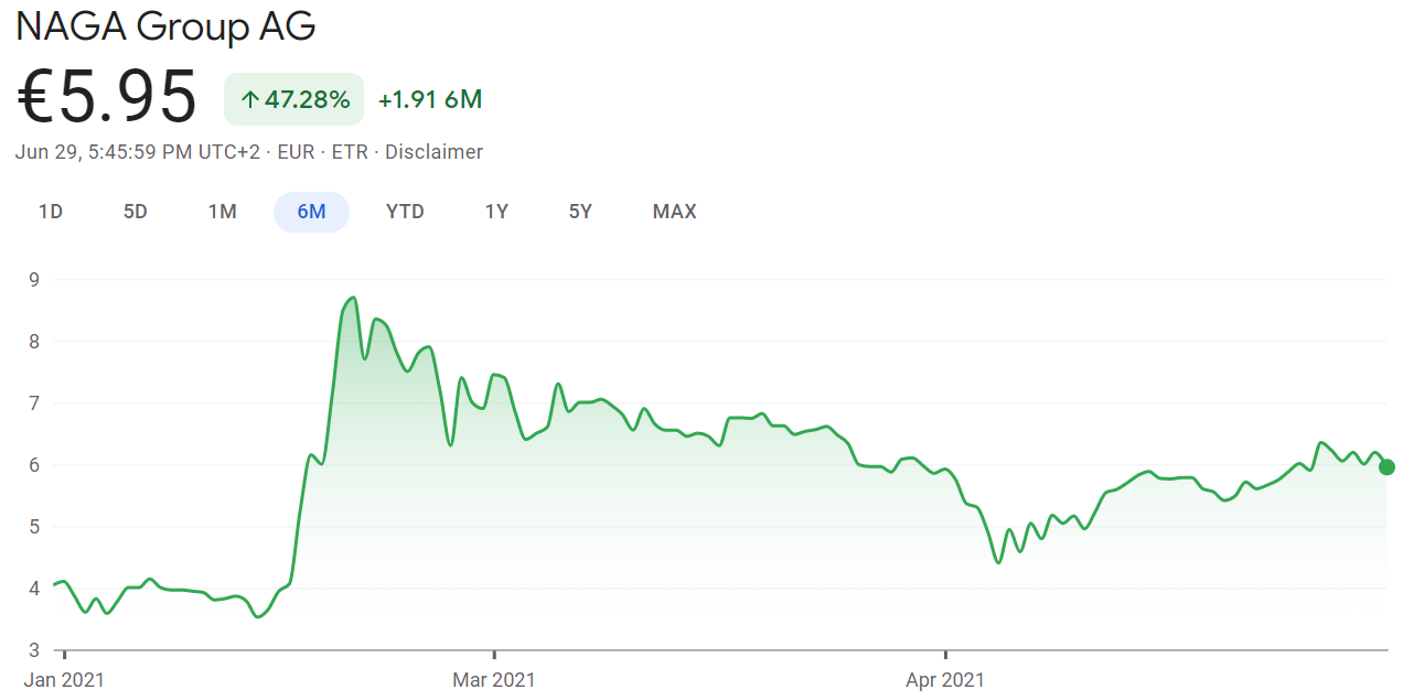 NAGA Group AG shares, 2021 year-to-date. Source: Google Finance.