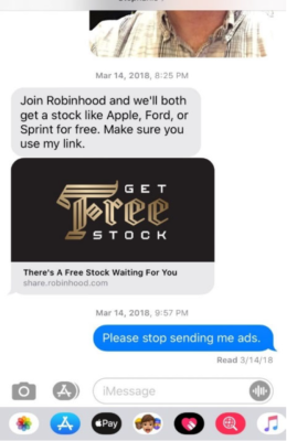 Online trading company Robinhood Financial LLC has responded to a complaint about allegedly spam text messages that formed part of a referral program.