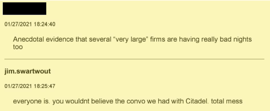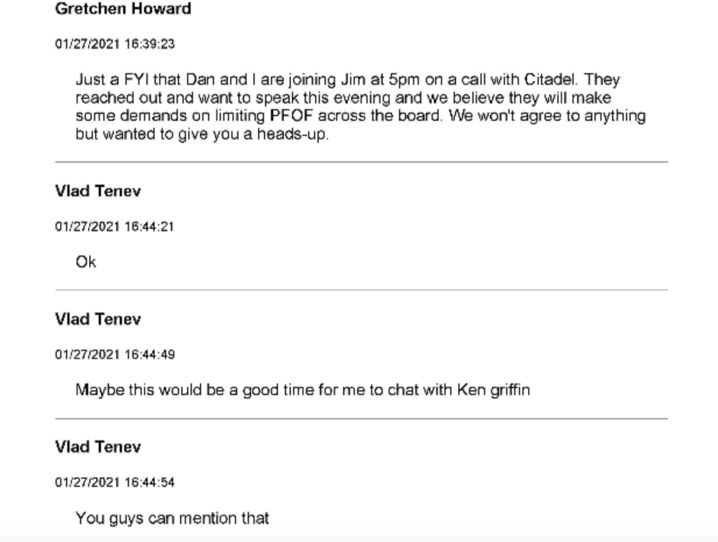 Additionally, Robinhood’s Drobnyk appeared to accept Citadel Securities’s proposition made on January 20, 2021. Also, high level employees of E*Trade and Citadel Securities exchanged communications throughout January 28, 2021 to confirm certain orders were cancelled.