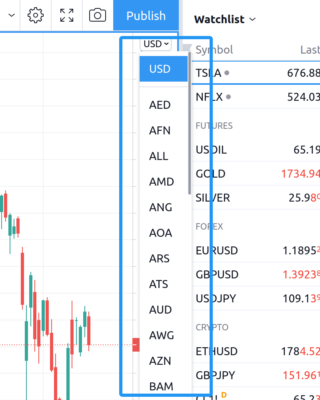 To change the currency on the chart, you just need to click on the button displaying the scale currency and then select the currency you are interested in from the drop-down list.