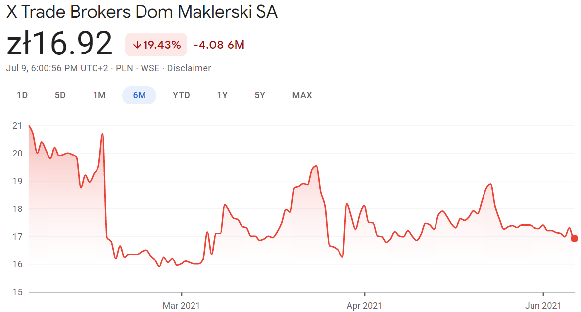 XTB share price past 6 months. Source: Google Finance.